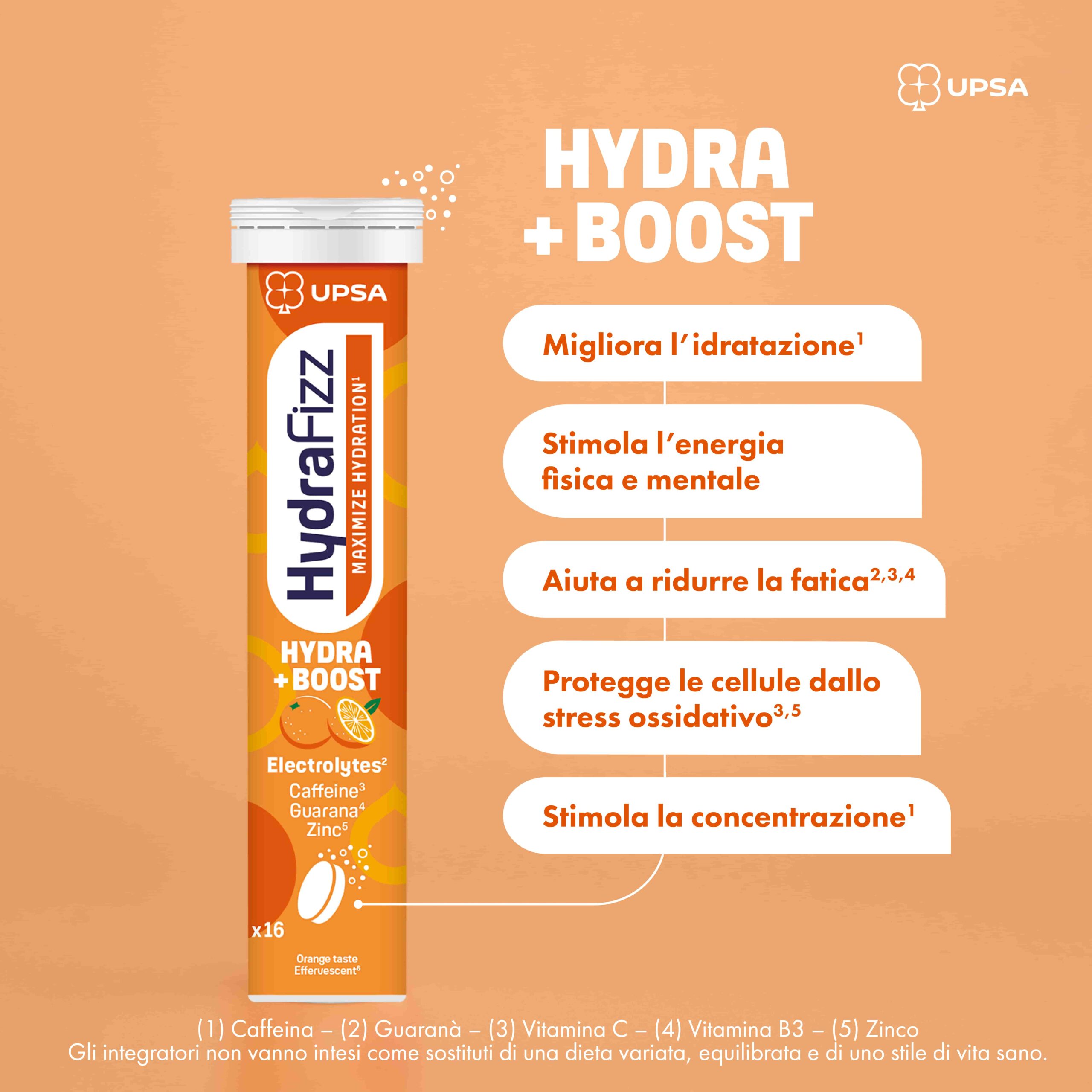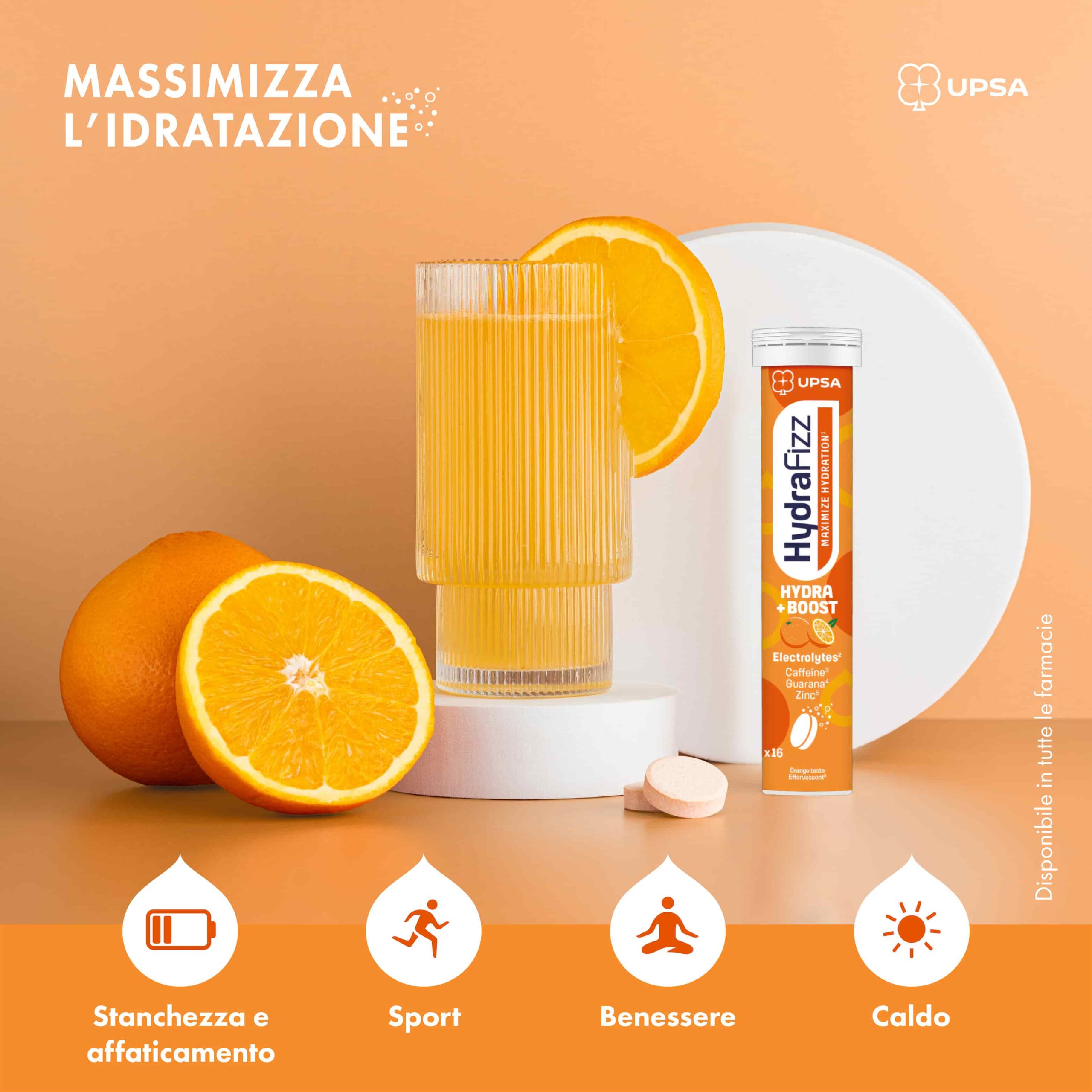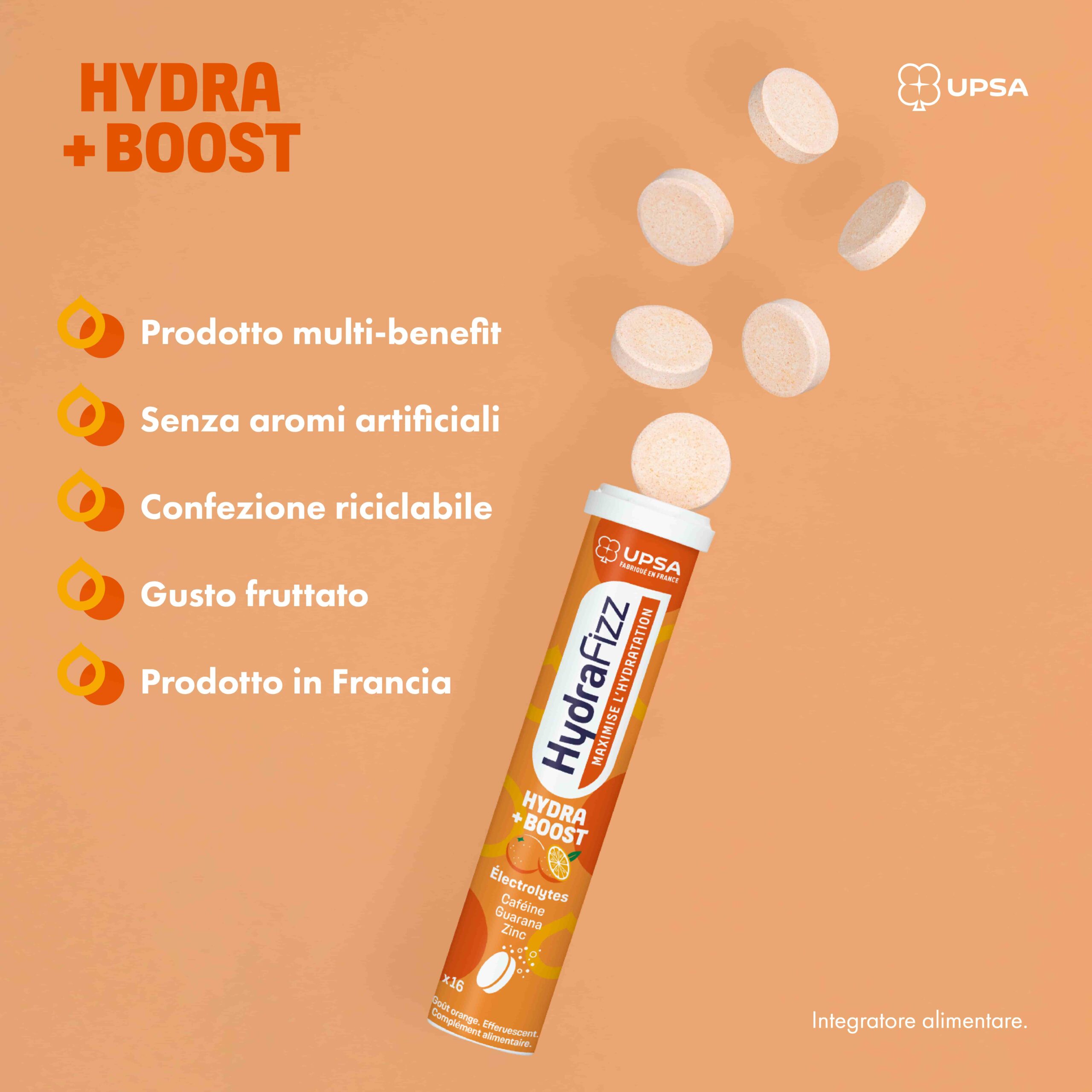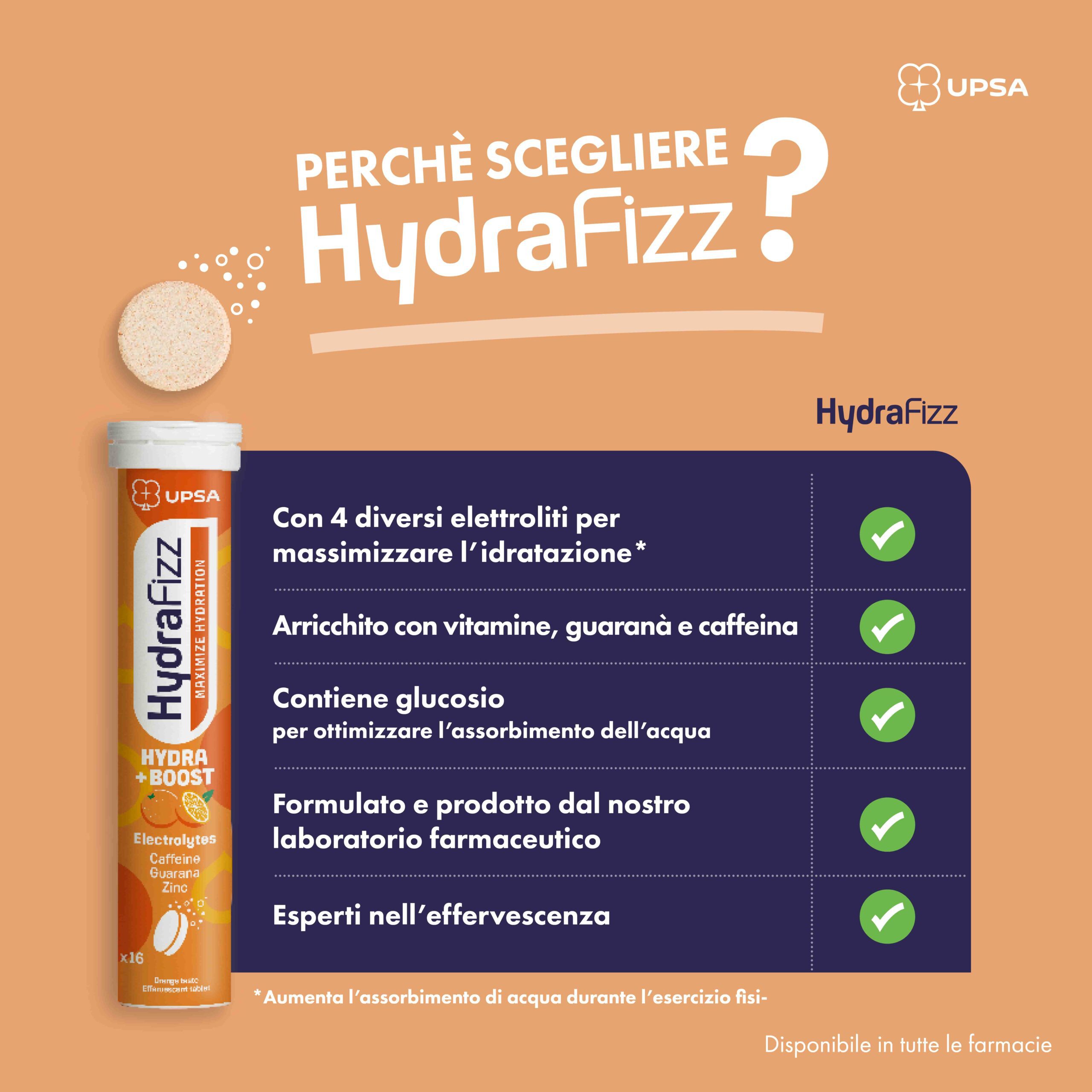 Per accompagnarti nella tua maratona quotidiana, il laboratorio UPSA ha creato HydraFizz Hydra +Boost: